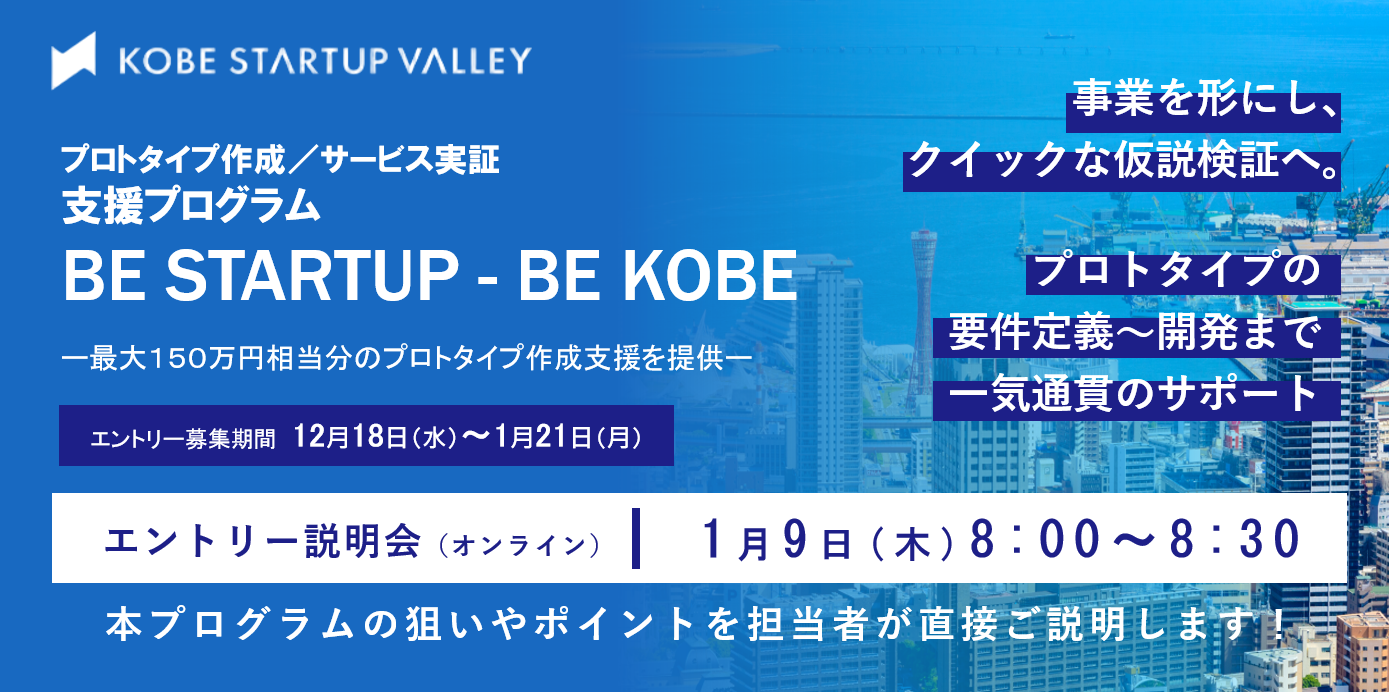 その一環で、これからスタートアップを目指す起業家を対象とした、プロトタイプ作成・サービス実証支援プログラム「BE STARTUP – BE KOBE」を実施します。