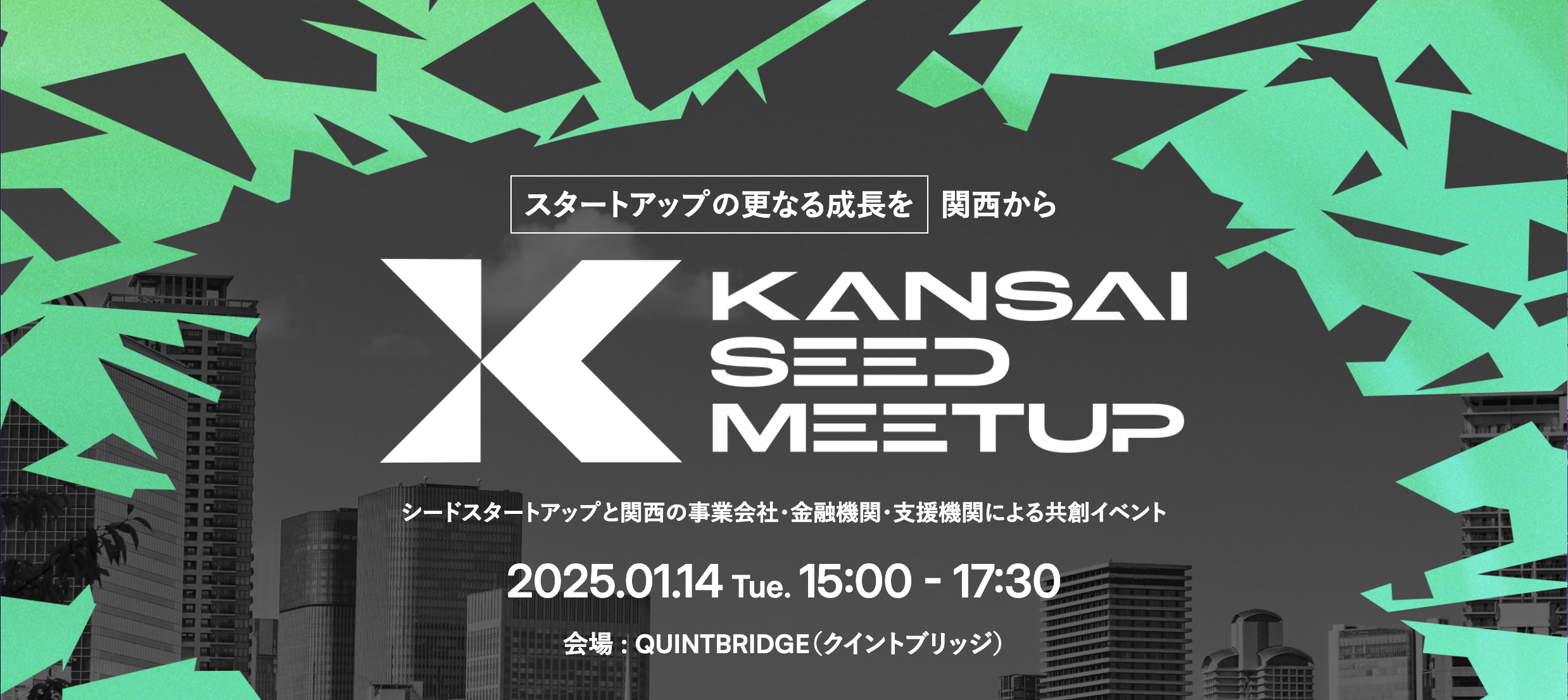 【PRTIMES(2024/11/21)】KANSAI SEED MEETUP、1月14日(火)にQUINTBRIDGEにて開催決定!関西・西日本で活躍するシード期~のスタートアップ10社強が一堂に集います!